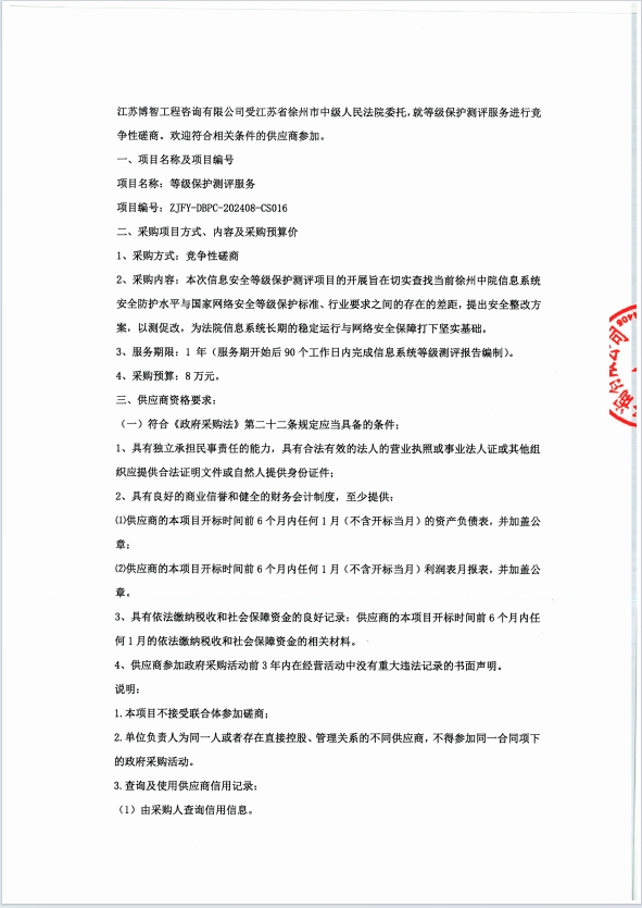 江苏省徐州市中级人民法院等级保护测评服务竞争性磋商公告